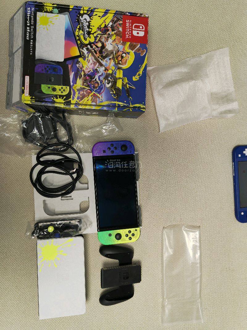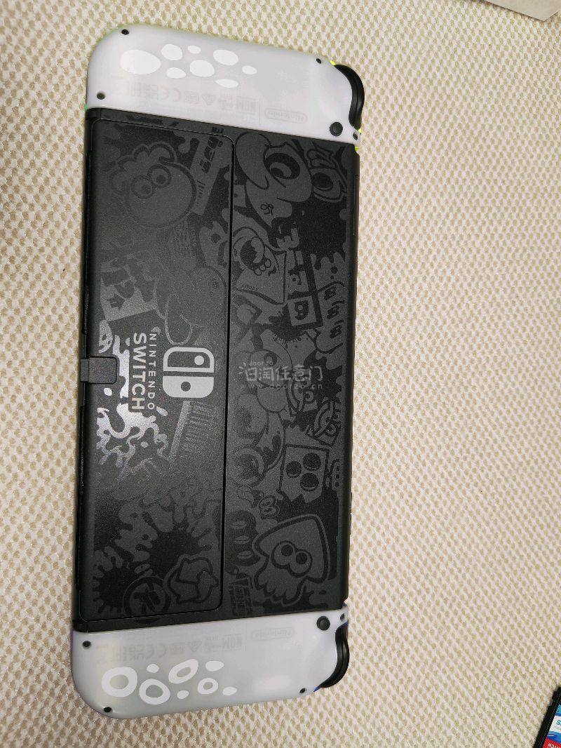 喷射战士3限定版Switch OLED采用黄紫渐变配色,搭配游戏主题涂鸦设计,被公认为任天堂掌机中颜值最高的机型之一。手柄腕带、主机底座等配件均采用同主题图案,外包装也采用喷绘风格设计