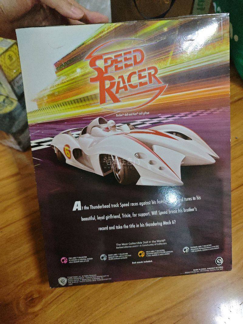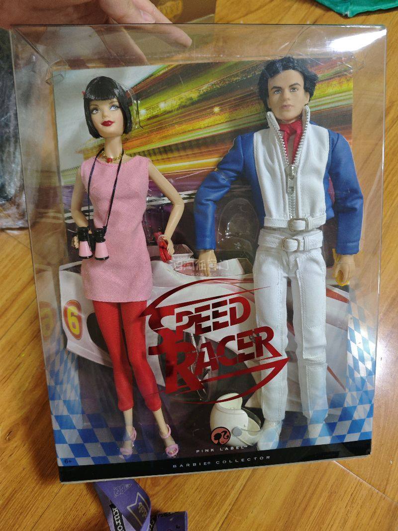 这是一套以经典动漫《极速赛车手》(Speed Racer)为主题的芭比收藏系列人偶套装,属于芭比收藏系列的“粉标”(Pink Label)系列,是芭比品牌为动漫与收藏爱好者打造的特色藏品。 《极速赛车手》是一部具有广泛影响力的日本动漫,以惊险刺激的赛车竞速和鲜明的角色形象著称,这套芭比人偶精准还原了动漫中的核心角色风格。套装中的女性人偶身着粉色无袖连衣裙,搭配红色紧身裤与粉色凉鞋,黑色短发造型利落,手持粉色双筒望远镜与红色配饰,细节处的项链更增添了时尚感,完美塑造出动漫中活力与优雅兼具的女性角色形象;男性人偶则身着蓝白拼接的赛车服,搭配白色赛车裤与白色鞋履,红色领巾点缀其中,身旁的白色赛车头盔进一步强化了赛车手的身份特质,将动漫中赛车手的飒爽英姿展现得淋漓尽致。 从收藏价值来看,芭比“粉标”系列本身就因限量发行和独特设计,在收藏市场备受青睐。这套《极速赛车手》主题套装,融合了经典动漫IP与芭比人偶的精致工艺,对于《极速赛车手》的粉丝、芭比收藏爱好者以及动漫人偶收藏者而言,是极具纪念意义与收藏价值的藏品,它不仅是玩具,更是动漫文化与时尚收藏文化交融的载体,见证了不同文化符号在收藏