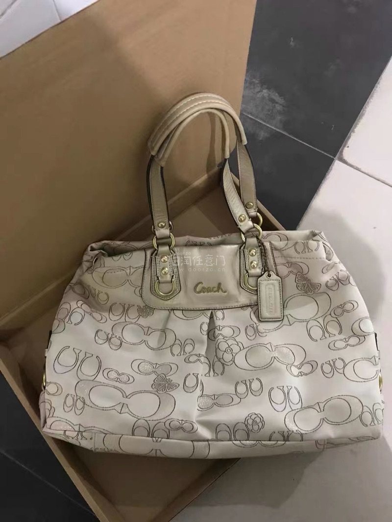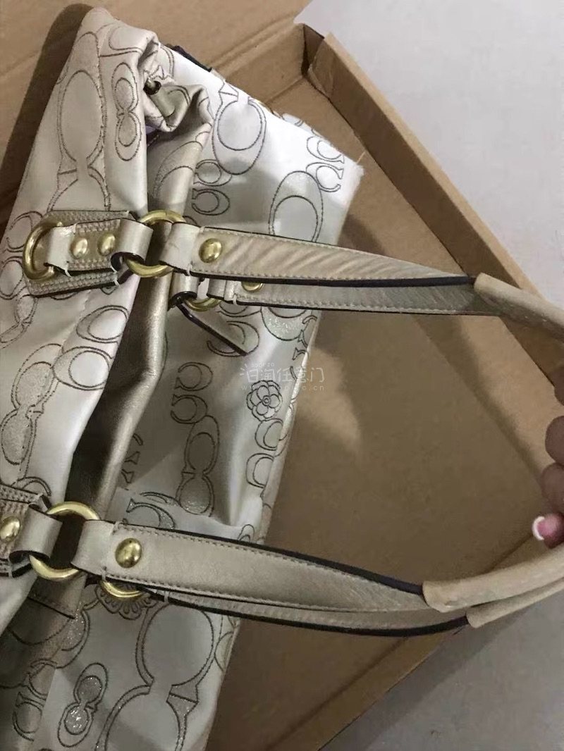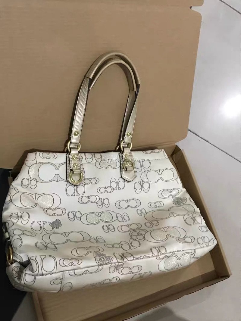 收到这只Coach中古托特包真的是近期购物里的小惊喜!实物比图片看起来更有质感,温柔的香槟金色自带柔光滤镜,满印的经典logo花纹搭配低调的暗纹设计,摸起来是细腻的缎面质感,拿在手里精致又不张扬~ 外观检查了一圈,包身、提手和五金件都几乎没什么明显瑕疵,金色搭扣的光泽度也保持得很好,完全不像放置了一段时间的中古包!不过毕竟是存放较久的款式,打开包包内侧能看到轻微的胶印痕迹,是皮革和内衬长时间贴合留下的,用湿纸巾轻轻擦了擦没完全去掉,但不影响日常使用~ 最惊喜的是它的容量,电脑、水杯、化妆包一股脑塞进去都没问题,提手的宽度刚好,长时间拎着也不会勒手。作为一只中古包,这个品相已经超出预期啦,复古又实用,不管是通勤还是逛街背都很合适,喜欢vintage风格的姐妹可以放心冲~
