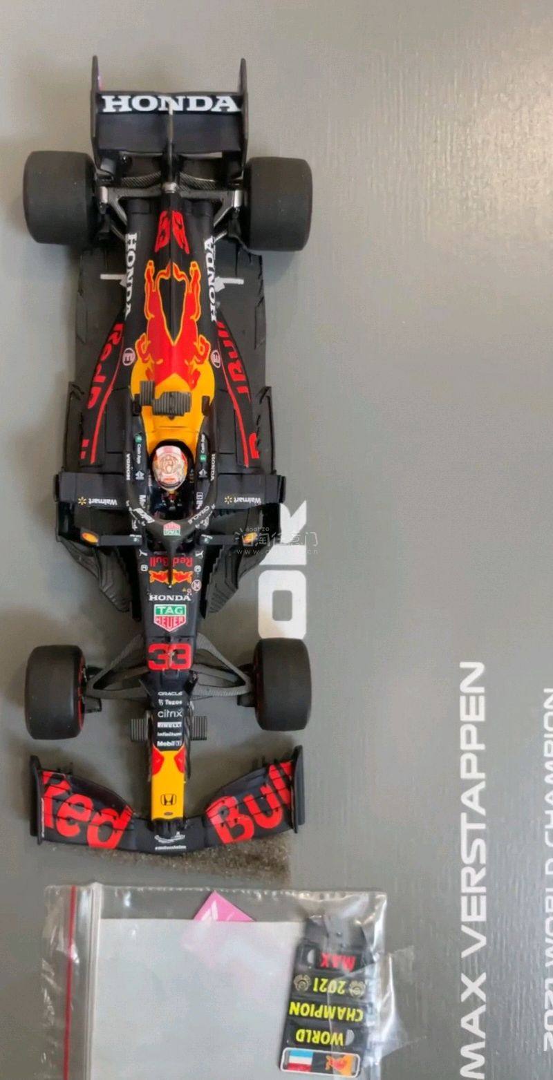 在24拉斯维加斯正赛结束后,维斯塔潘提前三站加冕四冠王。红牛车队也至此达成了第二个四连冠追平了自己的巅峰荣耀!现收第一冠rb16b看看王朝刚刚开始的空力车做工如何 眼前的这台RB16B则是维斯塔潘生涯首台总冠赛车,在2021赛季的收官之战以一种颇有争议的方式绝杀汉密尔顿。在为老汉败走八冠征途惋惜的同时,我也确切地感受到维斯塔潘在那个赛季的压迫感,恐怖的实力足以配得上冠军之名 模型采用了非常规的大盒形式,地台上的细节则是还原了赛道停车台路面上的喷绘:“Verstappen Or Hamiton”的样式,赛前两人的积分差距极小,冠军归属颇具悬念。不过可惜无论从整体颜色或细节方面做的不是十分到位,某宝上有更贴近现实的地台贴纸在售;同时随模型附赠的还有成绩牌和pit板,完全体的陈列也让模型的质感得到了进一步提升 相比迷你切给出的白胎样式,Spark所还原最后冲线时的红胎来得带情感寄托以及搭配上我觉得更是一个好的搭配!