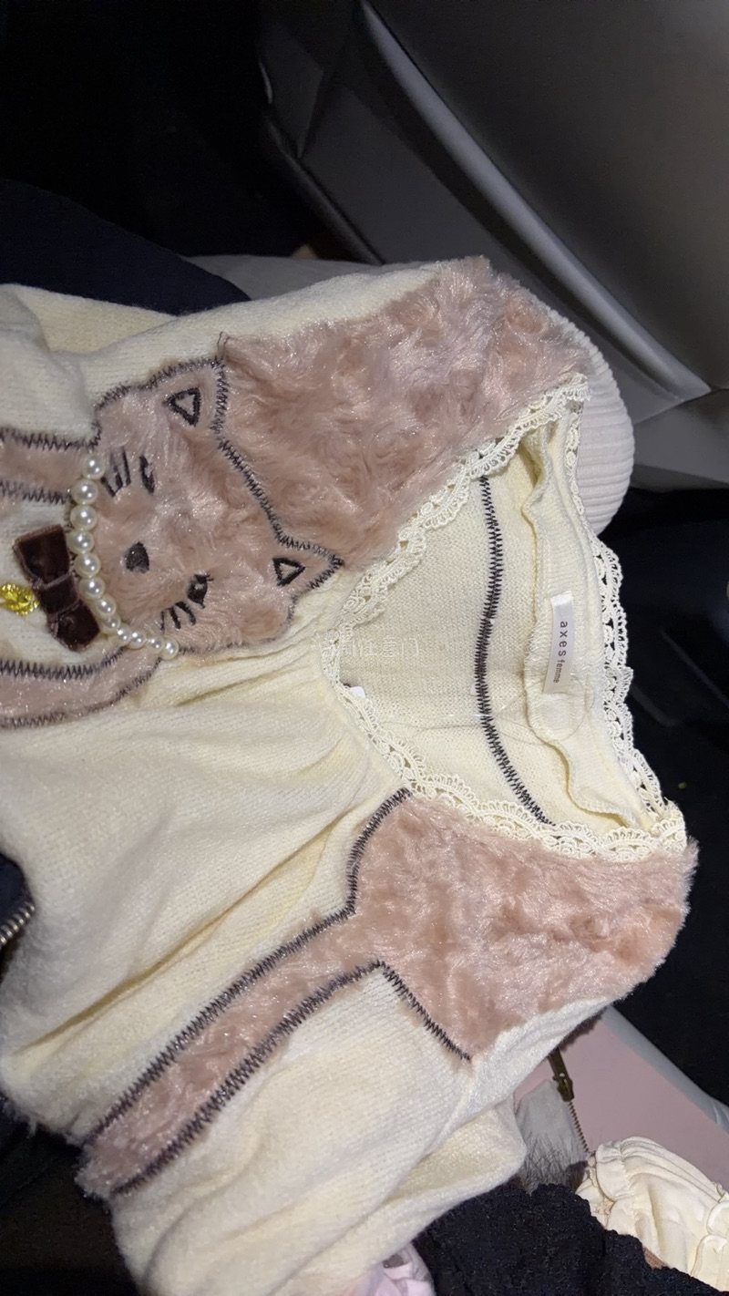 挖到axes femme的宝藏针织衫啦!奶白底色搭毛绒小猫超软萌,珍珠装饰和蕾丝边细节感拉满,贴身穿也舒服~日系甜妹风拿捏住,搭半裙或背带裤都超合适,真的爱惨这个款✨